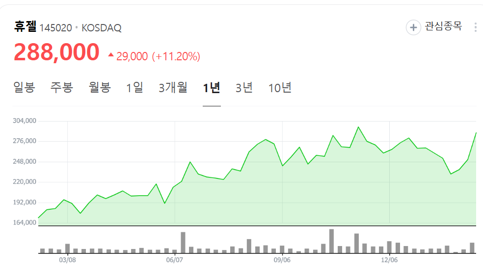 아래 예시 링크를 통해 2025년 2월 14일 기준 휴젤(145020)의 주가 흐름 차트를 확인하실 수 있습니다.